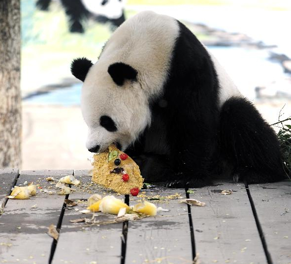 太原,2014年8月2日 太原动物园为大熊猫“彩陶”“湖春”庆生 8月2日,太原动物园的大熊猫“彩陶”在享用生日蛋糕。当日是山西太原动物园大熊猫“彩陶”和“湖春”的四岁生日,动物园组织了数十名“小小志愿者”,与大熊猫一同开“生日派对”。 2013年5月,“彩陶”和“湖春”从中国保护大熊猫研究中心雅安基地来到太原动物园,借养期一年。日前,太原动物园与中国保护大熊猫研究中心协商决定,“彩陶”和“湖春”将继续留在太原生活。