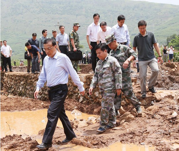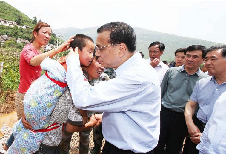 8月4日,受中共中央总书记、国家主席、中央军委主席习近平委派,中共中央政治局常委、国务院总理李克强代表党中央、国务院,代表习近平,飞赴灾区,察看灾情,现场指挥抗震救灾工作。李克强飞赴地震灾区后,乘车赶往此次云南鲁甸地震的震中龙头山镇,并徒步5公里多来到震中受灾最严重的龙泉村,实地察看灾情,指挥抗震救灾工作,看望慰问受灾群众。新华社记者姚大伟摄