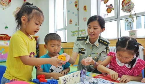 8月7日,边防官兵与孩子们一起游戏。当日,吉林图们边防检查站的官兵志愿者来到图们市阳光幼儿园留守儿童课堂,与孩子们一起游戏、学习,度过愉快的一天。吉林省延边朝鲜族自治州图们市赴外国务工人员多,留守儿童多,众多学校、幼儿园、社区都在暑假期间开设了留守儿童课堂。