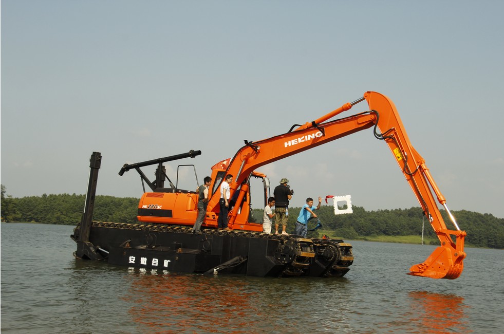 据悉,该产品由位于肥东的安徽合矿机械股份有限公司自主研发的第三代智能清淤(挖掘)机,它是在湿地液压挖掘机的基础上通过技术创新,并融入先进的设计理念进行革命性设计的产品,也是全国第一台深水智能清淤(挖掘)机,具有深水挖掘、清淤、搅吸、打桩等多重功能,它的问世将满足国内外大多数河道、湖泊、沿海滩涂的多功能工程作业需求。