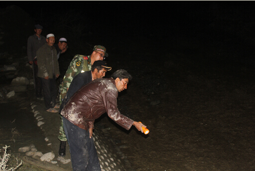 检查站官兵与当地群众在泥石流现场搜救失踪人员