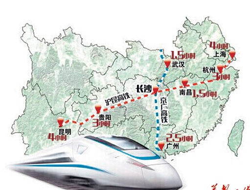 这意味着,届时长沙可以1.5小时到武汉、南昌,2.5小时到广州,3小时到深圳、郑州、杭州,4小时到上海,5小时到北京……一幅全新的出行新版图将展现在长沙市民面前,也势必会助力湖南在新一轮经济发展浪潮中抢占先机。