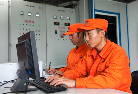 8月17日,“高分二号”卫星发射前夕,太原卫星发射中心的两名技术人员在发射塔架内操作空调设备,为火箭和卫星保持合适的温度和湿度。