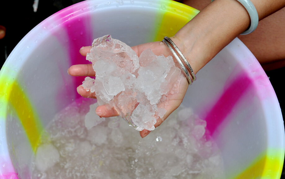围观人群往水桶里放进冰块