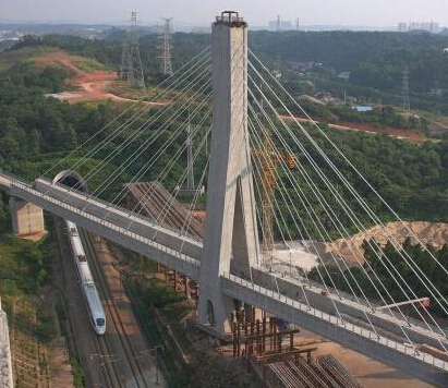由于沪昆高铁和京广高铁在长沙交汇,为了不影响京广高铁的正常运营,建设公司分别建设了西北联络线跨京广高铁转体斜拉桥和南西联络线跨京广高铁转体斜拉桥。李永清说:“先在平行于京广线的方向把桥梁主体建好,这样避免了给京广线造成危险,在建好后让桥面转体,与沪昆线两边线路对接,同时跨国京广线。”