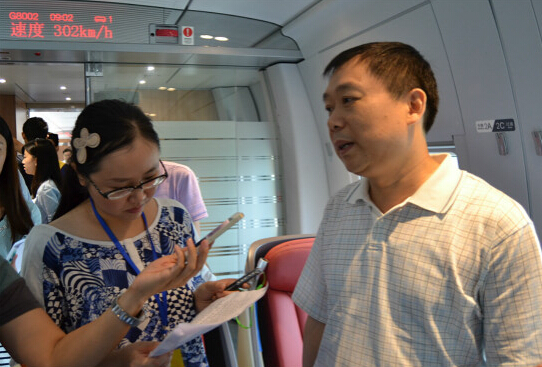 沪昆专线湖南公司的工程部部长李永清介绍“姊妹桥”转体合拢刷新了世界铁路建设史上的难度纪录。(本报记者唐竟淳摄)