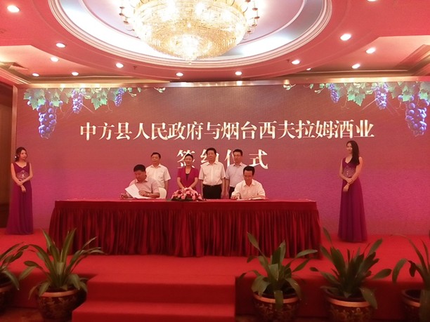 新闻发布会上烟台西夫拉姆酒业与中方县人民政府签订战略合作协
