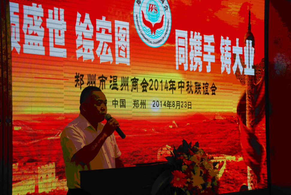【香港商报讯】记者王斐、贺永召报道:“独在异乡为异客,每逢佳节倍思亲。”8月23日下午,郑州市温州商会2014年中秋联谊会在郑州嵩山饭店举行。联谊会的主题是:颂盛世,绘宏图,同携手,铸大业。郑州温州商会会员、理事、常务理事、副会长、常务副会长等各个阶层,相聚一起,共同迎接即将到来的象征团圆的中华民族传统节日—中秋佳节。河南省、市、区相关部门及全省各异地商会的领导应邀出席了郑州市温州商会中秋联谊会。