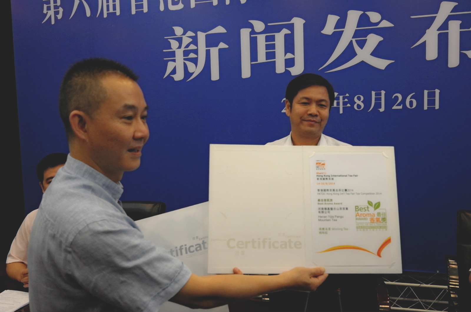 8月14日,第六届香港国际茶展开馆首日,亿嘉盘古山茶茶业有限公司参展参赛的"桐柏红"获得红茶组冠军和最佳香气滋味奖,"盘古神针"获得绿茶组季军,从来自世界各地的近百个参赛茶品中脱颖而出,连获三项国际殊荣,成为当日最大赢家。这是以毛尖闻名于世的河南省首次赴港参展并参加茗茶比赛,也是河南省茶叶首次在香港获得相关奖项。河南省商务厅副厅长、河南省茶叶协会会长、2014年河南赴港参展代表团团长王勇表示,河南茶企获此三项荣誉是河南茶业界来之不易的荣誉和认可,也是河南茶企'走出去'迈出的一大步"。明年将加大参展参赛力度,扩大参赛规模,让更多河南企业走出去。