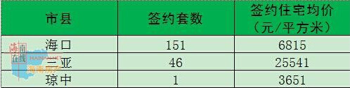 签约量方面,海口签约151套,三亚签约46套,琼中签约3套。其他市县无数据。