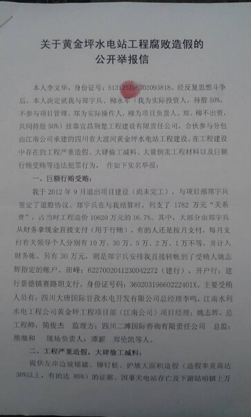日前,有大渡河黄金坪水电站左岸坝肩锚索支护工程施工人员李文华、卢世涛实名向本报反映该工程在施工中存在偷工减料、工程造假、监理和施工队伍暗中勾结谋取不法利益等。