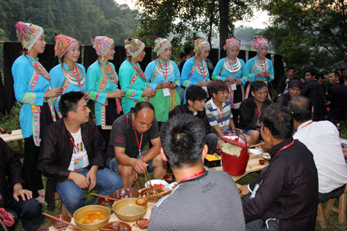秋收开镰“祭萨”活动上,侗族姑娘在给客人唱敬酒歌