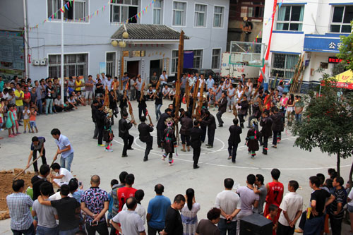 2014年8月27日,贵州省黔东南州黎平县水口镇水口、滚政等村寨侗族同胞齐聚水口村,为秋收开镰举行隆重的 “祭萨”活动,借祭祀先祖之机,祈求国泰民安,五谷丰登。活动主要有吹芦笙、踩歌堂、“哆吔”等内容,吸引近万群众前来参加。(杨代富 杨国梁 摄影报道)