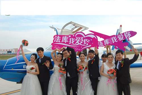 飞行大会闭幕式当天,四对新人举行了一场浪漫温馨的“空中婚礼”。在法库财湖机场,新郎们以四架特技飞机作为“婚车”,牵手自己美丽的新娘