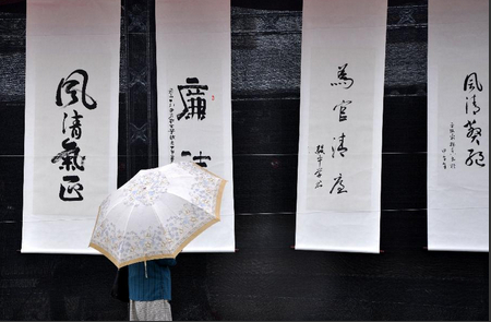 9月10日,一位市民在观看廉政书法作品。当日,“运城市反腐倡廉群众书画大赛”作品展在运城市南风广场举行。此次群众书画大赛以“书写反腐清风,画绘倡廉新象”为主题,展出反腐倡廉书法作品450多幅,绘画作品近200幅。
