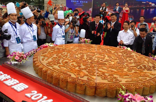 为沿袭中秋佳节赏月、吃月饼的传统习俗,现场邀请省、市领导和嘉宾代表共同揭开了“世界最大的百合月饼”——整个月饼为圆形,外形轮廓设计为百合型,直径2.14米、厚11厘米、总重量约900斤。选用优质莲子打底、优质的兰州特产百合约700斤为馅料,辅以160斤的面粉,按照皮馅1:4的比例,由兰州安旗食品有限公司的20名月饼大师,经过包馅、成型、烘烤等13道工艺,用时两天精心加工而成。月饼中间为“相聚兰州”主题活动字样,周边设计有六位身形飘逸、容貌俊美的古代飞天,即彰显兰州热情淳朴积极向上的城市形象,又展示兰州非物质文化遗产和悠久历史交汇融合的独特魅力,寓意“百合团圆吉祥”!