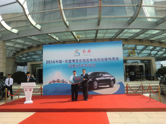 【香港商报讯】实习记者戴竺芯报道:日前,2014中国—东盟博览会指定专场活动接待用车交接仪式在广西民族博物馆举行,中国—东盟博览会秘书处副秘书长黄平西从一汽轿车销售有限公司副总经济师张伟的手中接过具有象征意义的车钥匙。届时,25辆红旗H7轿车将为本届博览会与会各国贵宾及商界精英提供商务出行和服务。