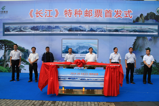 为纪念新中国成立65周年,中国邮政特别发行《长江》邮票长卷版,将9枚邮票连印,全长57厘米,是目前我国最长的邮票。 9枚邮票分别为:大江东去、山水重庆、三峡奇观、楚湘临江、庐山水韵、黄山独秀、金陵春晓、江畔水乡和东流入海。