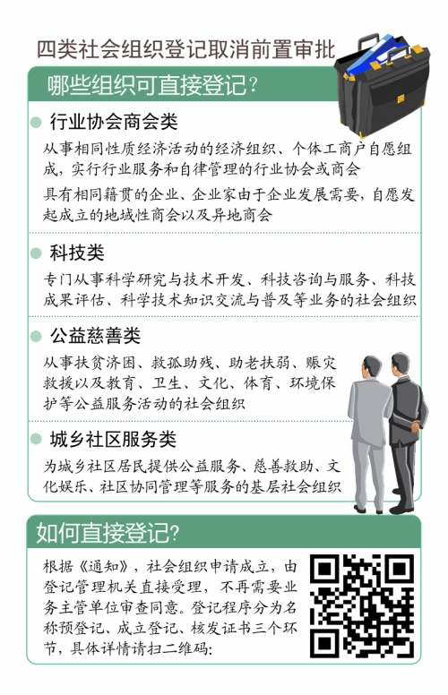 昨日,省政府办公厅发布《关于四类社会组织直接登记的通知》(以下简称《通知》),从9月1日起,全省行业协会商会类、科技类、公益慈善类、城乡社区服务类等四类社会组织,不再需要业务主管部门前置审批,可直接向民政部门依法申请登记。