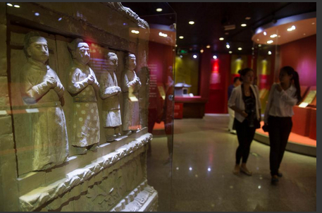 9月16日,观众在北京辽金城垣博物馆欣赏金代山西戏曲砖雕精品。