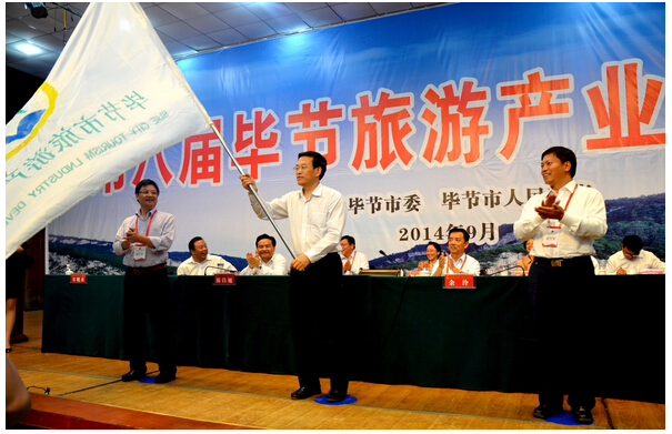 [香港商报讯] 记者 黄庆松 报道:9月24日,毕节市第八届旅游产业发展大会暨2014乌蒙文化旅游节在金沙县召开。毕节市委书记、市人大常委会主任张吉勇向第九届市旅发大会承办地纳雍县授旗。省旅游局副局长余泠,毕节市长陈昌旭出席会议并讲话。