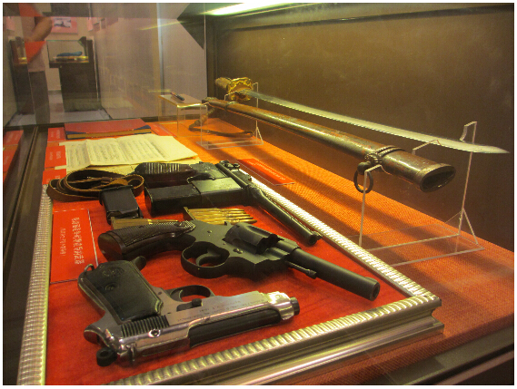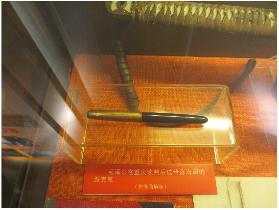 在展出的文物中,陈海涵将军生前缴获的日本军刀以及所用的左轮手枪吸引了众多参观者驻足观赏。陈海涵将军家属告诉记者,展出的这把日本军刀是1938年陈海涵在晋察冀特务团担任政治委员时缴获的,左轮手枪则是彭德怀将军当年奖励给他的。而说起旁边单独摆放的一支钢笔时,陈海涵家属自豪地介绍到:“这是我父亲在延安学习时,毛主席赠予的重庆谈判时所用的钢笔。”