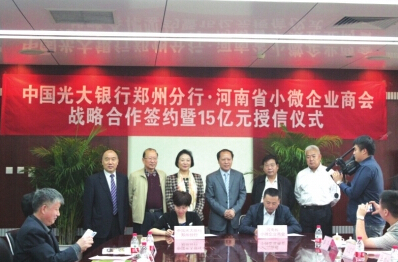 9月30日上午,在河南省工商联指导下,河南省小微企业商会(小微商会)与中国光大银行股份有限公司郑州分行战略合作签约暨15亿元银行授信仪式在郑州举行。据河南省小微企业商会会长杨清河介绍,这15亿元资金将全部注入我省小微企业,助推我省民营企业发展。