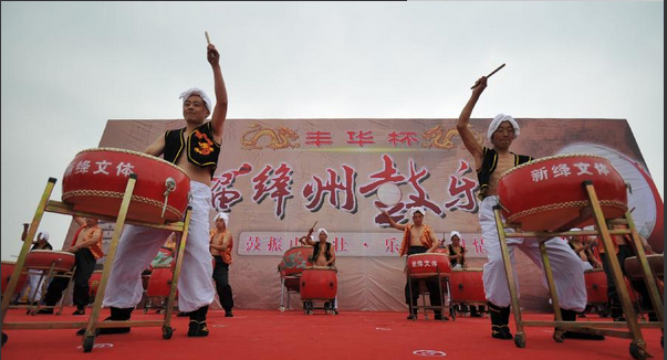 10月12日,参赛鼓乐手在表演绛州鼓乐《群鼓贺一品》。当日,“中国鼓乐艺术之乡”山西省运城市新绛县第二届绛州鼓乐大赛进入第二天的激烈角逐,来自当地各乡镇的鼓乐好手齐聚一堂,倾情演绎国家级非物质文化遗产绛州鼓乐《秦王点兵》《杨门女将》等经典曲目,会场鼓乐喧天,热闹非凡。