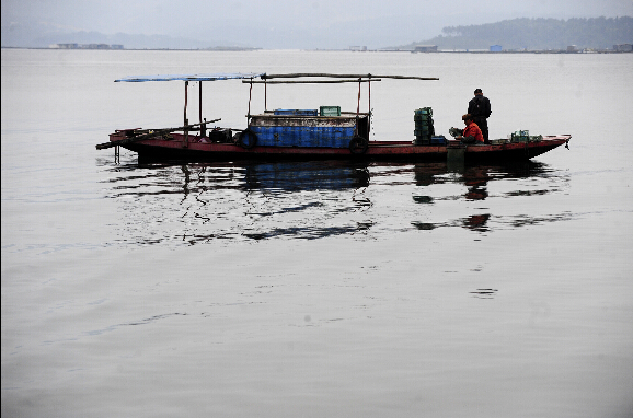 渔民在丹江口水库水面上整理渔具