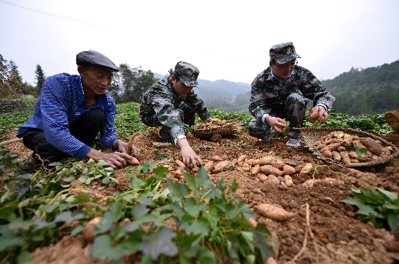 10月15日,湖北省恩施州宣恩县民兵在宣恩县万寨乡白果坝村帮助残疾农民代少兵(左一)抢收红薯