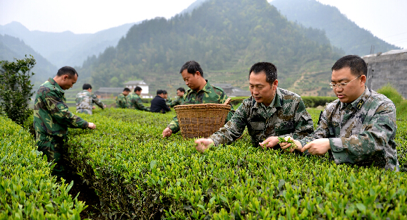 湖北省恩施州宣恩县人武部民兵在宣恩老寨溪村为缺少劳力的茶农抢采春茶