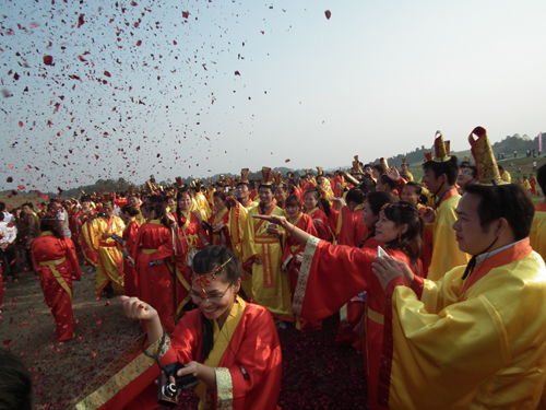 本届活动一大亮点是不仅有中国夫妻,还有来自国外的新婚夫妇,他们身着汉服,行中国传统婚礼,为盛典增添了一抹国际色彩。