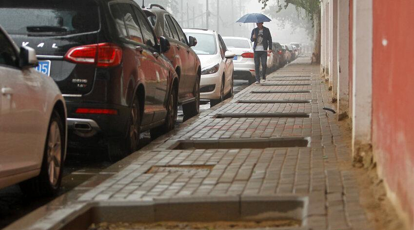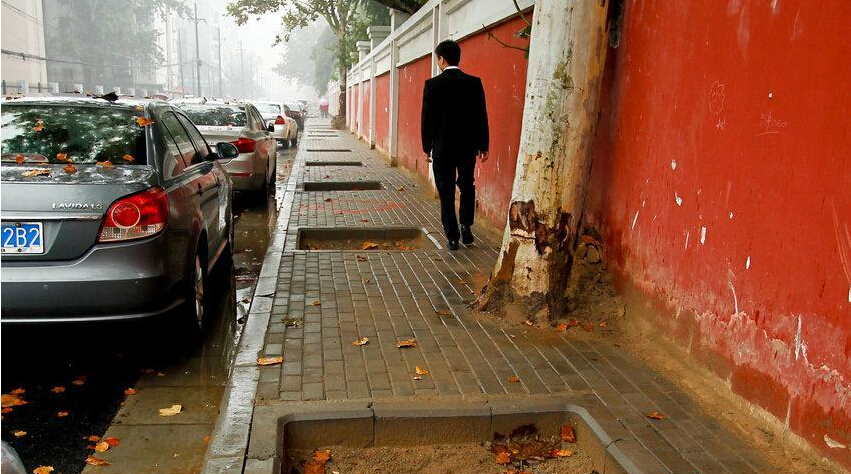 帖中图片显示,狭窄的人行道,左边是停放的车辆,右边是一堵红色高墙,人行道上预留的一个个树坑占据了人行道的大部分路面,树坑两侧只留下狭窄的道路。