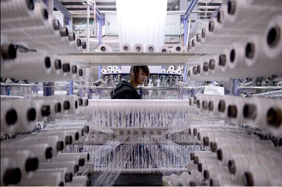 10月24日,在辽宁省康平县塑编龙头企业沈阳时代塑编包装有限公司彩色复合塑编生产线上,圆织工人正在作业。
