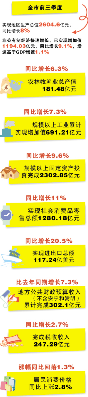 昆明市統計局新聞發言人、黨組書記、局長呂志介紹說,初步核算,前三季度全市實現地區生產總值2604.6億元,按可比價格計算,同比增長8%,增速較上半年回落0.4個百分點。其中:第一、第二和第三產業分別實現增加值103.59億元、1133.91億元和1367.1億元,同比分別增長6.1%、8.5%和7.7%。