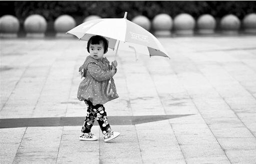 一位小朋友雨中撐傘