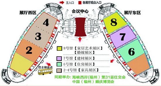 中國(福州)家具建材裝飾品博覽會共分:家具館、建材館、家裝設計館、家居飾品館、第31屆住交會展示館以及婚博會展示館,涵蓋了家居生活的一切必要需求,種類相當齊全。第四屆中國(福州)家建展不僅延續去年共同結合福州住交會,與住交會更加緊密合作,還首次將福州首屆時尚婚博會融入其中。
