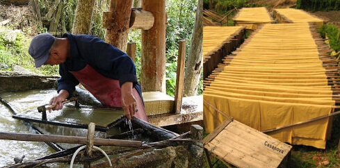 特別有意思的是,高山漢保留了古老的“手工造紙術”。造紙的原料很普通:竹子、石灰和水。有一種原料叫“滑水”,一種有點粘滑的油狀物,是用樂業“老鼠杉”樹的根皮搗爛后做成的。往紙漿里加“滑水”的目的是使紙漿能沾連在一起,做出的紙光滑不粗糙。掌握這種古老造紙術的能工巧匠主要居住在樂業縣的把吉村。