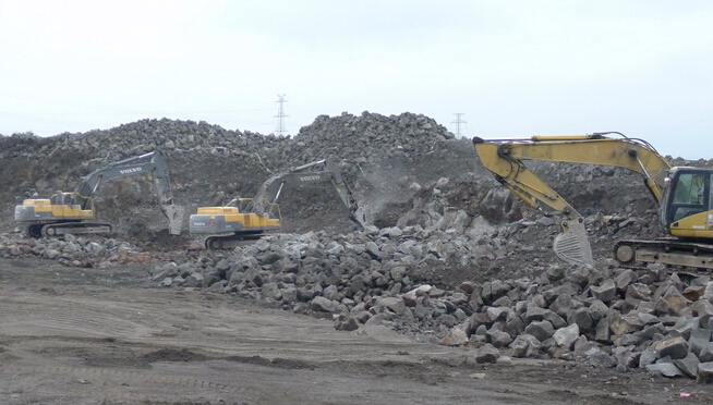 記者將村民投訴情況反映給海口市國土秀英分局長流管理所后,引起工作人員重視,連同分局執法隊一同前往展源石場進行查處。上午11時50分,當國土執法人員抵達石場時,礦區、加工區、銷售區一片熱火朝天的繁忙景象:12臺VOLVO、CAT牌大型炮機在南北兩個礦區將坡地鉆挖成大型石塊;近10輛編有阿拉伯數字的改裝卡車,在礦區內來回運輸,將大型石塊運往加工區3條生產線;3條分別生產大石子、小石子、石粉的生產線,通過8條傳送帶將石塊進行加工,并將銷售成品堆成幾座小山;小山下,等候購買碎石的卡車排隊裝車,3臺鏟車一刻不停進行作業;石場大門口,大型地磅旁是財務室,過完地磅的車輛司機,進入財務室進行結算。整個采石場規模宏大,設備現代化,初步推算生產設備價值達數千萬元。