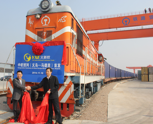11月18日11時18分,首趟“義新歐”(義烏——馬德里)鐵路班列從義烏鳴笛開出,奔向13052公里外的南歐貿易重地西班牙馬德里。至此,“義新歐”國際鐵路集裝箱班列正式加入中國鐵路“中歐班列”序列,成為中國東部沿海地區通往歐洲的第一條國際鐵路聯運物流大通道,21天后,由全球最大超市-中國義烏國際商貿城生產的耶誕節日用品將坐著國際班列進入千萬戶歐洲家庭,而義烏乃至浙江也將通過此次班列更好地融入絲綢之路經濟帶。