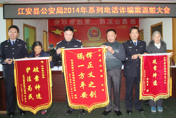 【香港商報訊】記者梅超、通訊員王思婧報道:“真的沒有想到我被騙的4萬多元還能追回來,真的太感謝我們江安的公安機關了,沒有他們的辛勤付出我們今天肯定是不能把錢要回來的。”在四川江安縣公安局退贓大會上來自江安縣四面山鎮的李先生激動的對記者說。11月27日下午,江安縣公安局在局機關四樓會議室隆重召開“2014年系列電話詐騙案”返贓大會,大會將追回的49萬余元現金返回給了20余名受害群眾,受到了人民群眾的高度表揚。