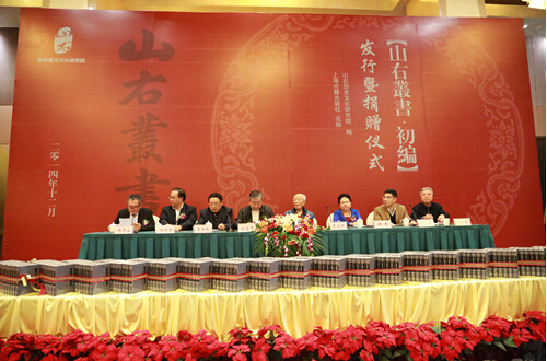 《山右丛书·初编》发行暨捐赠仪式 山西华宇集团董事长赵华山(左一) 山右历史文化研究院常务副理事长李玉臻(左三)