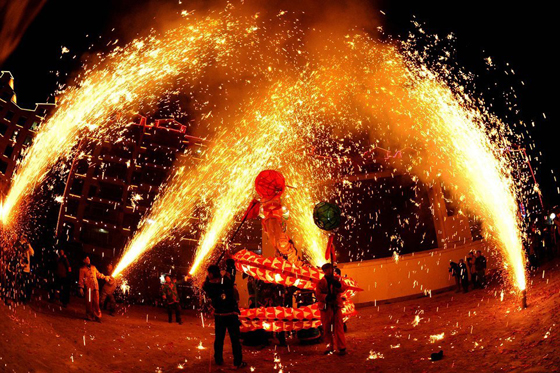 每年正月初七開始,縣城周邊的村寨就開始紮龍做花。而到了正月十五的夜晚,舞龍噓花之夜,舞者赤身裸體,不怕火花燙傷;噓者也是勇敢者,不怕追逐的勞累和艱險;觀者也是勇敢者,不怕花筒四射,緊追圍觀;無論男女老幼都可舞、可噓、可觀,場面精彩火爆,每年都會吸引來自海內外上萬遊客前來觀賞。由於“苗族舞龍噓花習俗”燃起眾人內心的情感世界之火,活動往往通霄達旦,著實地體現了苗疆兒女龍騰虎躍的勇敢和智慧。