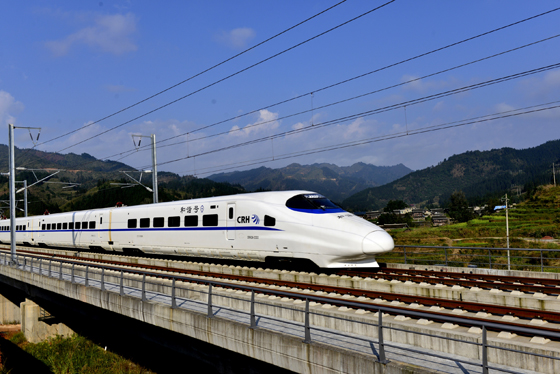 图为在贵广高铁贵州段按图行驶试验的和谐号动车经过榕江县境加会大桥-----王炳真 摄