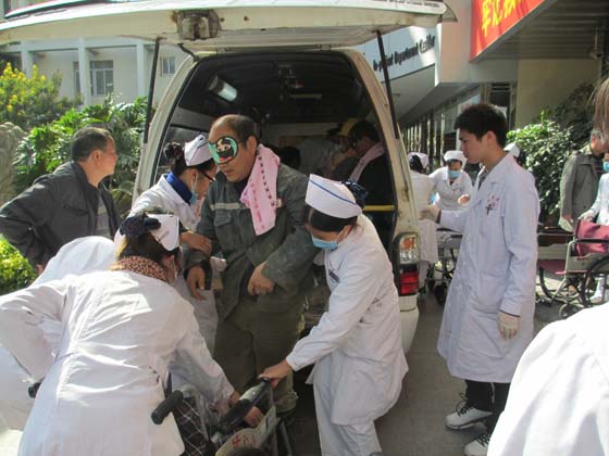 12點25分,第一批被困工人的救護車到達龍巖市第一醫院。記者隨即趕往醫院,對獲救工人的主治醫生進行了采訪。據龍巖市第一醫院急診科副主任醫師劉曉東表示,經過心電監測、血糖監測及生化檢測,目前21名病人的生命體征都比較穩定。接下來會對病人進行有針對性的治療。“我們已經有統一的治療方案,會針對不同的情況采取不同的治療。現在這里的病人基本都是一個醫生一個護士地進行處置。”劉曉東如是說。