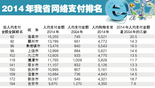 從江西省2014年人均網絡支付金額來看,南昌市、贛州市和景德鎮市分別位列前三位。對比2004年和2014年人均支付金額數據后,記者發現,南昌市網絡支付增幅最大,2004年人均支付745元,2014年人均支付15255元,后者約為前者的20.5倍。