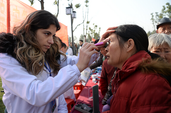 安徽省“三下鄉”活動中,古巴眼科專家阿里安娜正在為村民檢查眼病(鄭成功攝影)