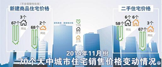二手房價格環比上漲個數比10月份有所增加。70個大中城市中,價格環比下降的是58個,持平的是6個,上漲的城市也是6個。
