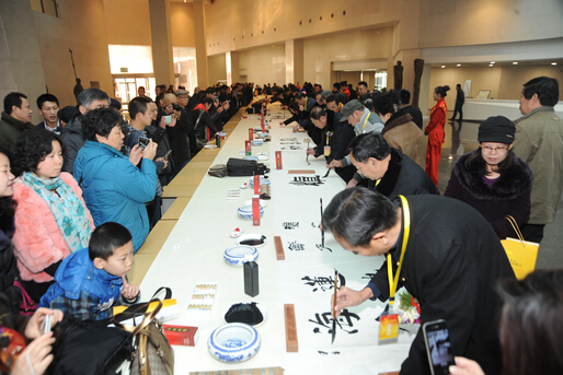 【香港商報網訊】記者祁曉峰報道:為紀念毛澤東誕辰121周年,12月29日“以翰墨迎新年,共筑中國夢”為主題的中國五臺山書畫藝術交流會暨作品展落幕。此次作品展邀請到包括原國務院副總理吳桂賢、藝術巨匠徐悲鴻之子徐慶平以及邢光輝、張子說、徐世葉、金理貴、宋吉祥、薛光禹、候永林、歸洪璋、劉保收、孫慧軍、包布和等在內的來自來北京、河北、西安、沈陽、大連等地的60余名書畫名家聚會山西太原。活動中,數十名書畫家一同繪制書畫長卷——在25.58米長的長卷上題詩作畫、盡情揮灑,成為本次活動的一大亮點。