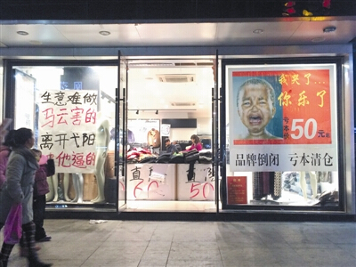 “生意難做,馬云害的,離開弋陽,被他逼的。”近日,弋陽縣匯金廣場多家服裝店前貼出這樣的清倉促銷海報。店員表示,網購對實體店的沖擊非常大,老板不得已才出此奇招。